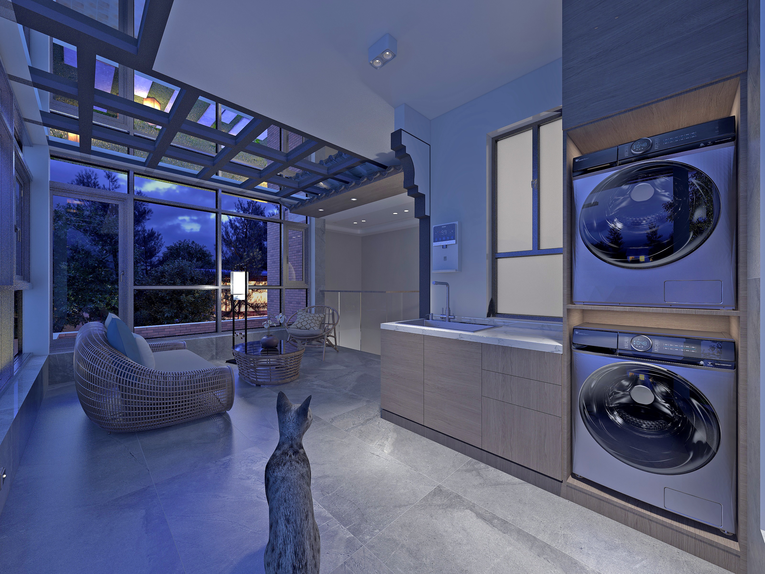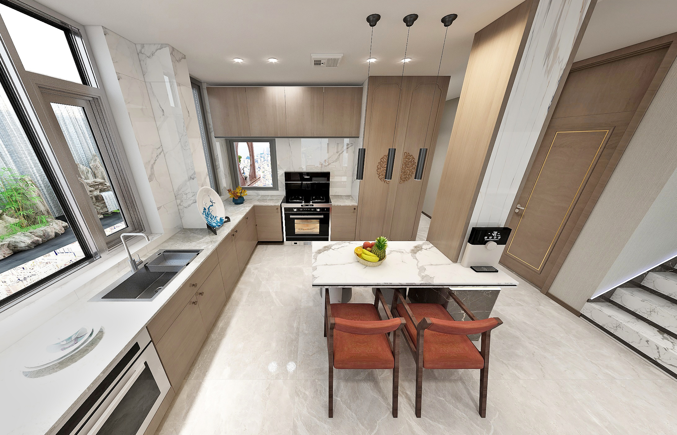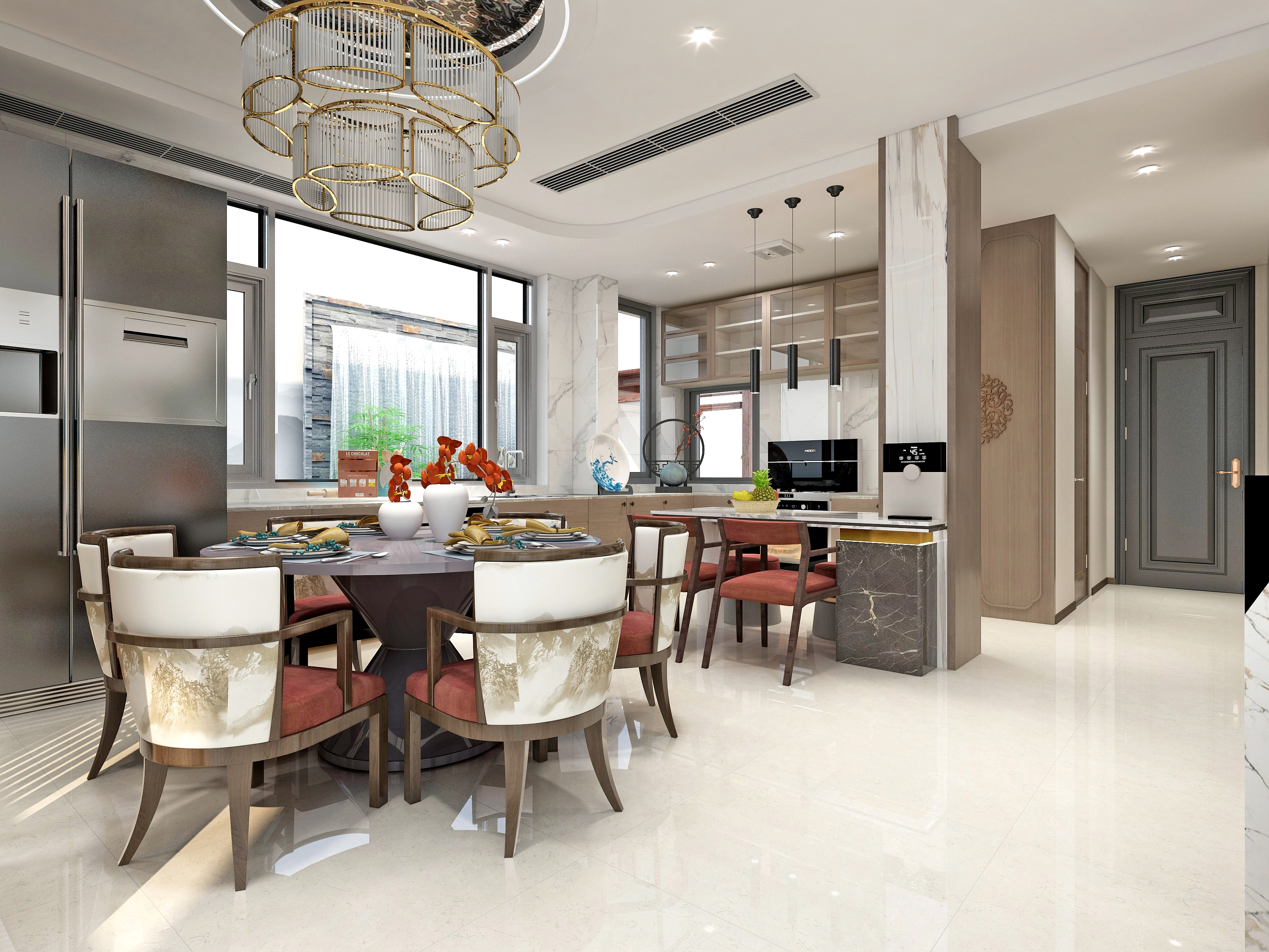 一碗时蔬,一碗热汤汤一碗香饭,自烟火气中成佳肴。隔窗欣赏户外山景色仿若飞舞蝶燕,中西式餐厅空间相互穿插的开放式厨房让空间灵活多变,“L字型”的设计简洁大方实用性强。圆形餐桌与水波纹吊顶相互呼应配上精致的水晶餐灯,以及精心定制的餐具摆设,就餐区处处彰显空间品质,**仪式感。
