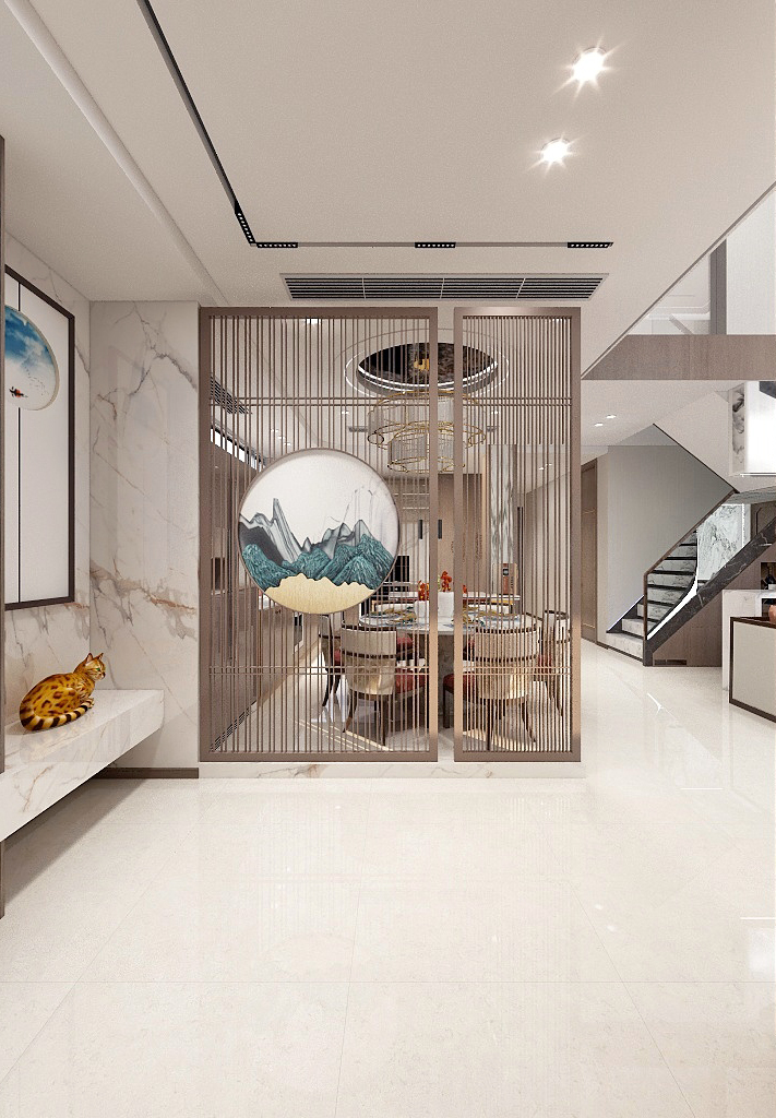 设计理念:本案业主是一对夫妻平常上班比较忙,喜欢中式的风格高大空间感,一家五口,有一个大女儿和小儿子及加加。为了满足日常生活需求设计师在原始户型上做了较大的改建以满足业主的高、大、尚的要求,一楼设置客厅、餐厅、西厨、品酒区、品茶区、长辈房、卫生间、洗衣房等空间。二楼起居室、公主房、公子房卫生间。三楼主卧、衣帽间、阳光房等作为对生活的致敬,设计师希望能借此设计唤起对家的归属感,不仅打造身之居所,更打造心之属地。