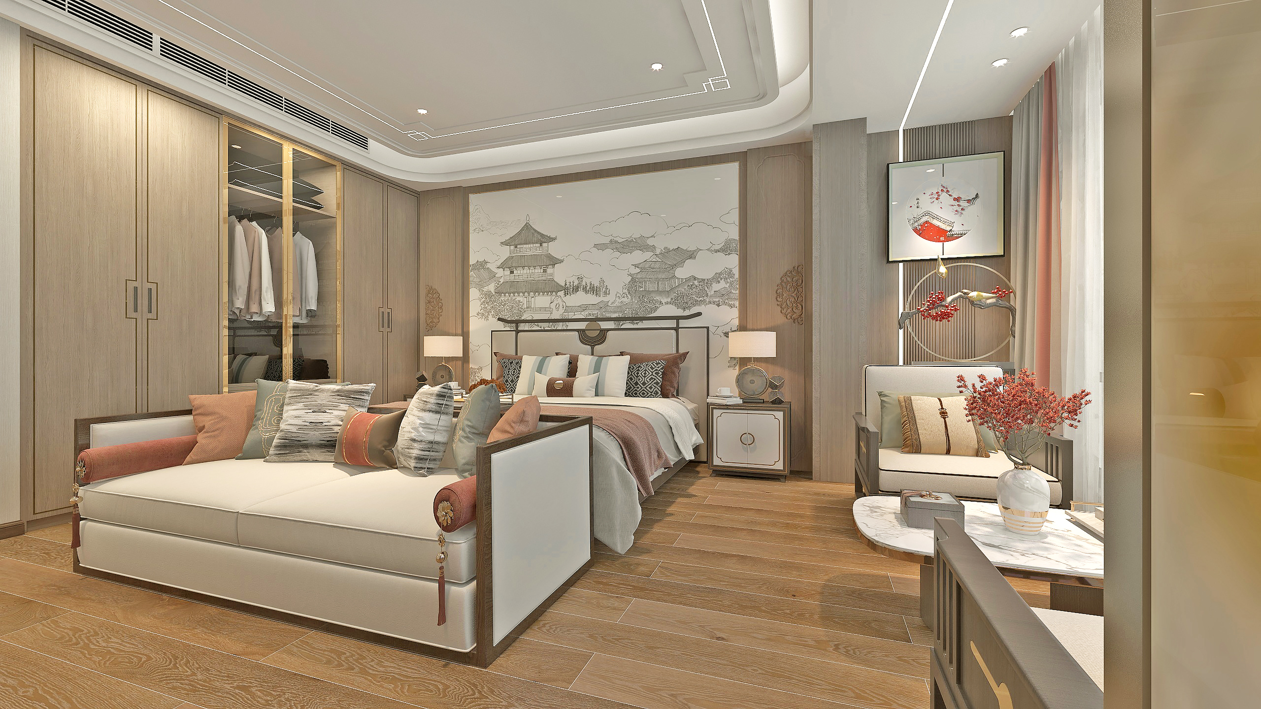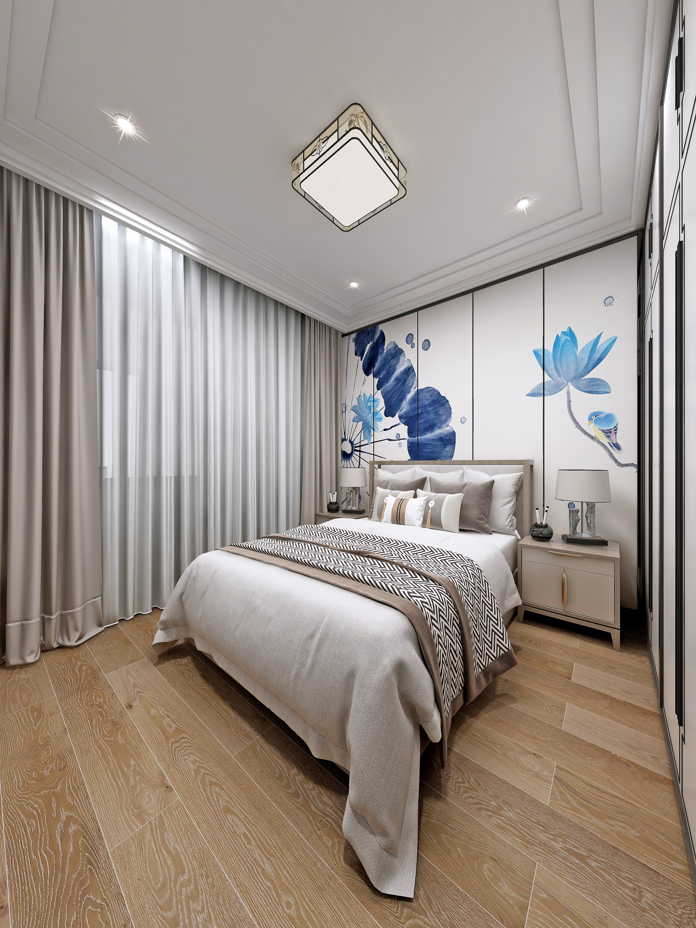 长辈房的设计追求庄重高雅,时尚而不浮躁。荷景背景与抱枕靠垫床品的相呼应舒适感与空间完整而和谐,浸润出静谧的生活氛围。