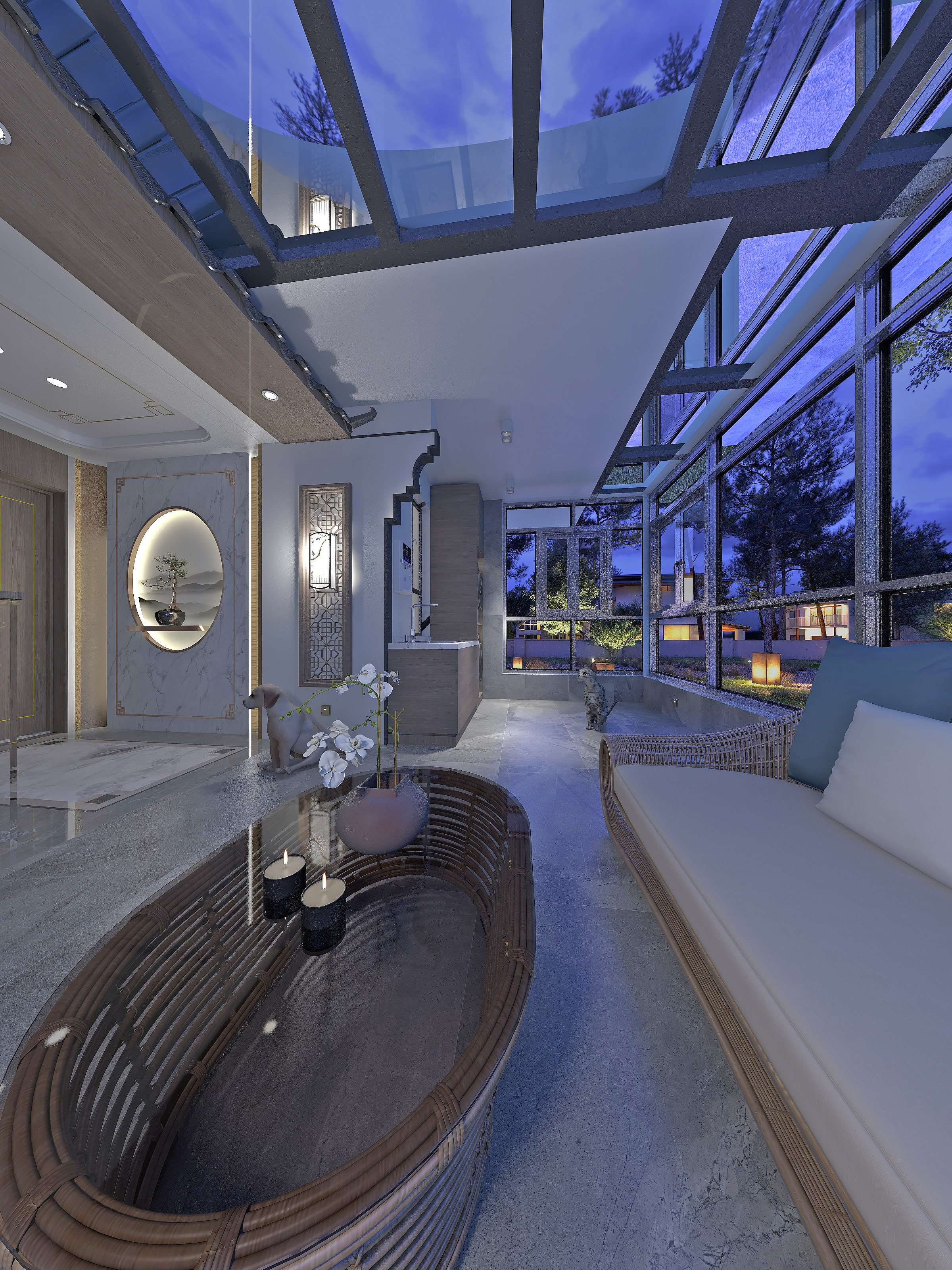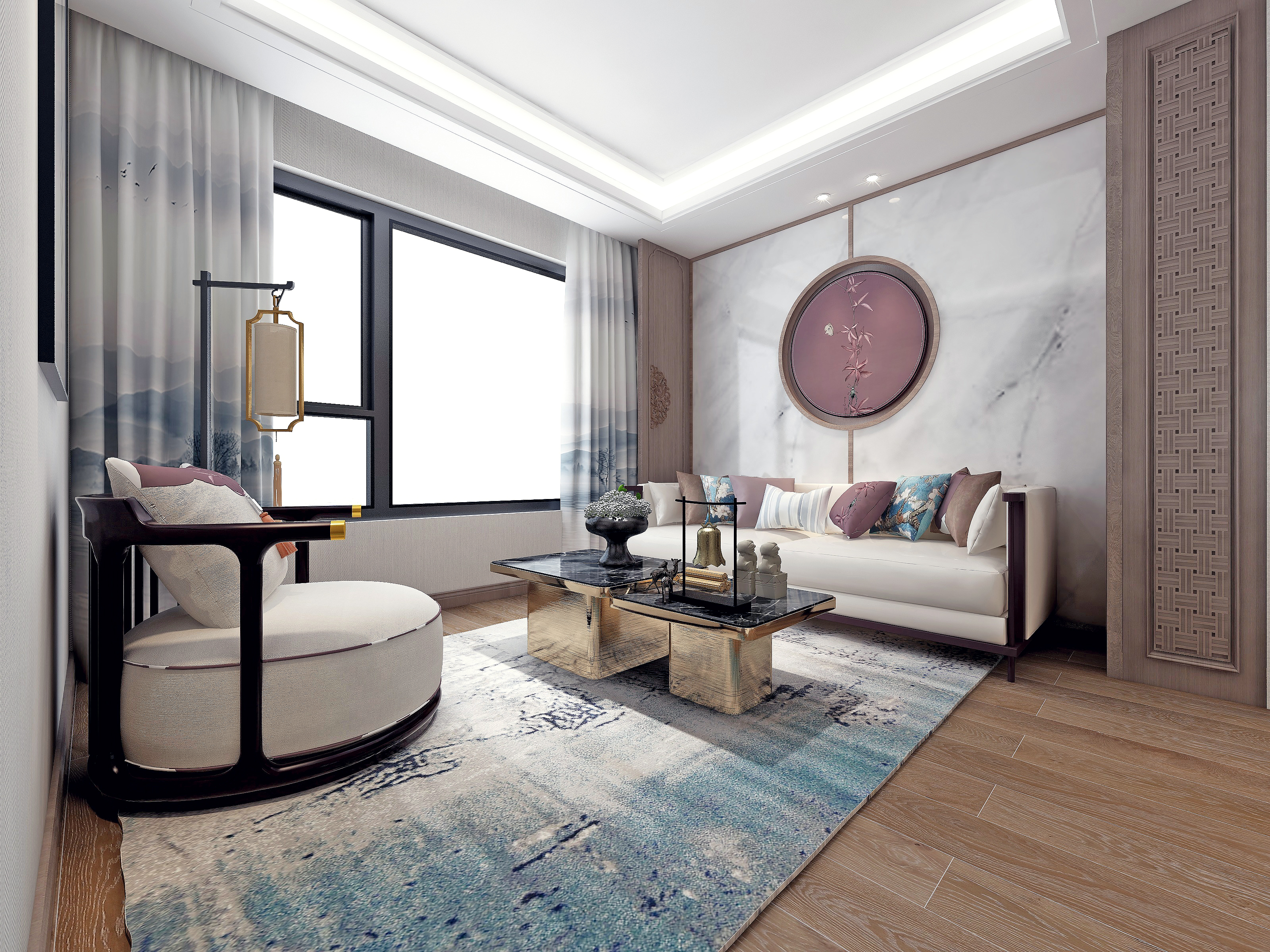 2楼起居室空间同样以新中式风格为重点打造,功能性与美观性俱佳。墙面采用大理石与原木墙板先结合是空间简洁不失内涵,大窗,引室外景致入内,增加空间层次。