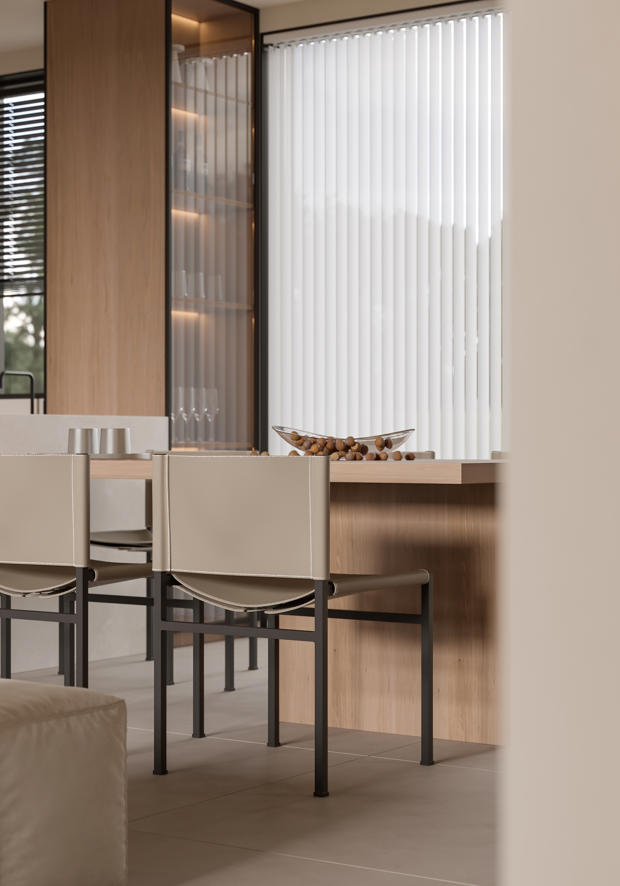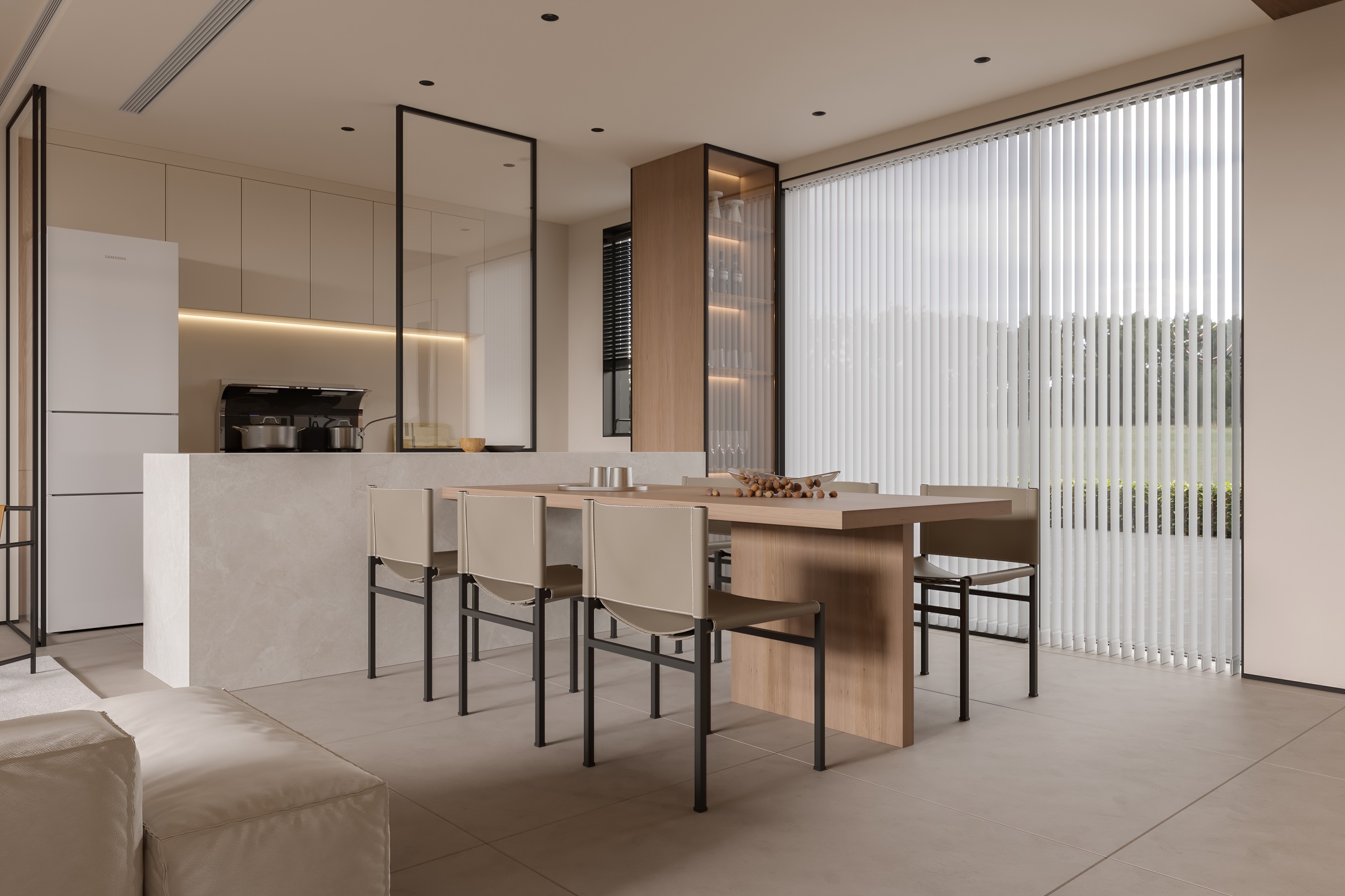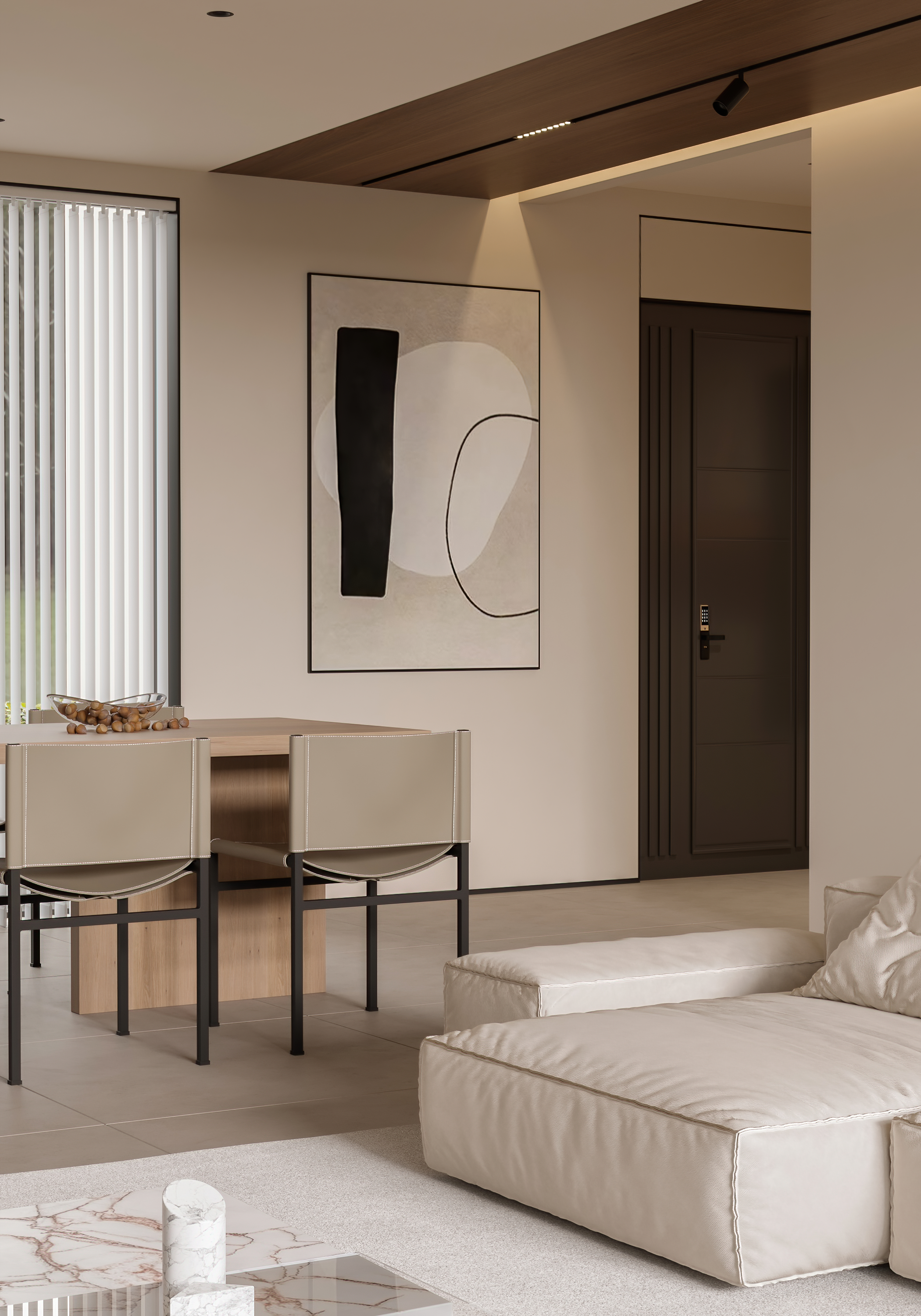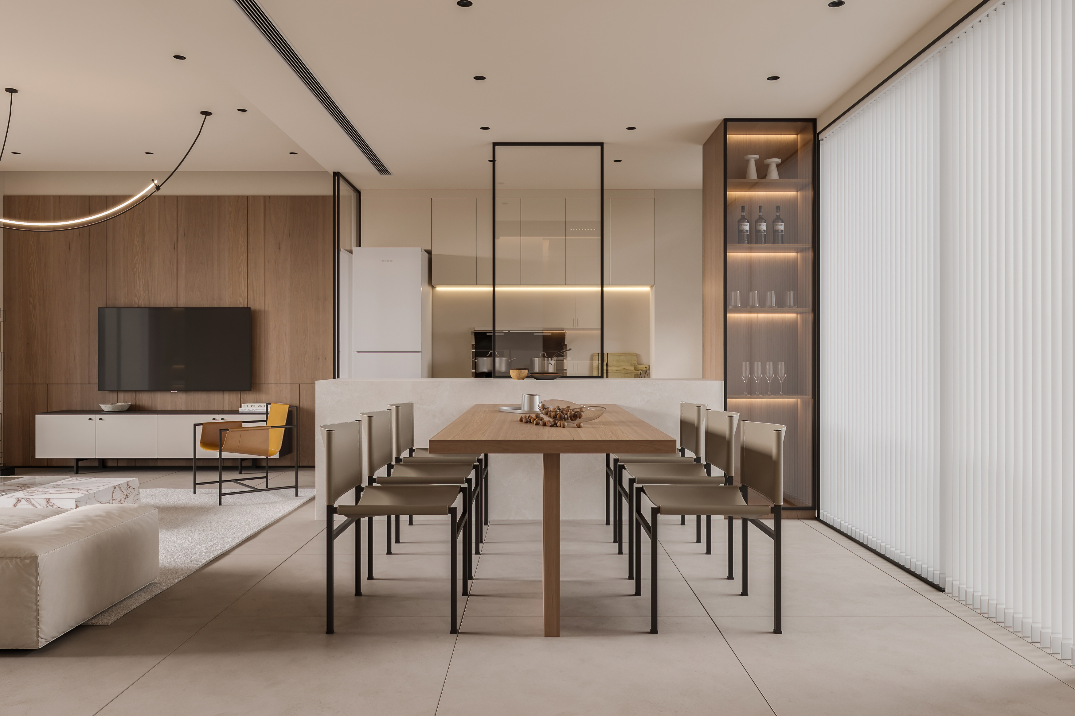 通过材质的运用与对比,客厅与餐厅形成互补的气质分区,每个空间能呼应碰撞,让相邻的空间保持视觉独立的同时,又不失连贯性。