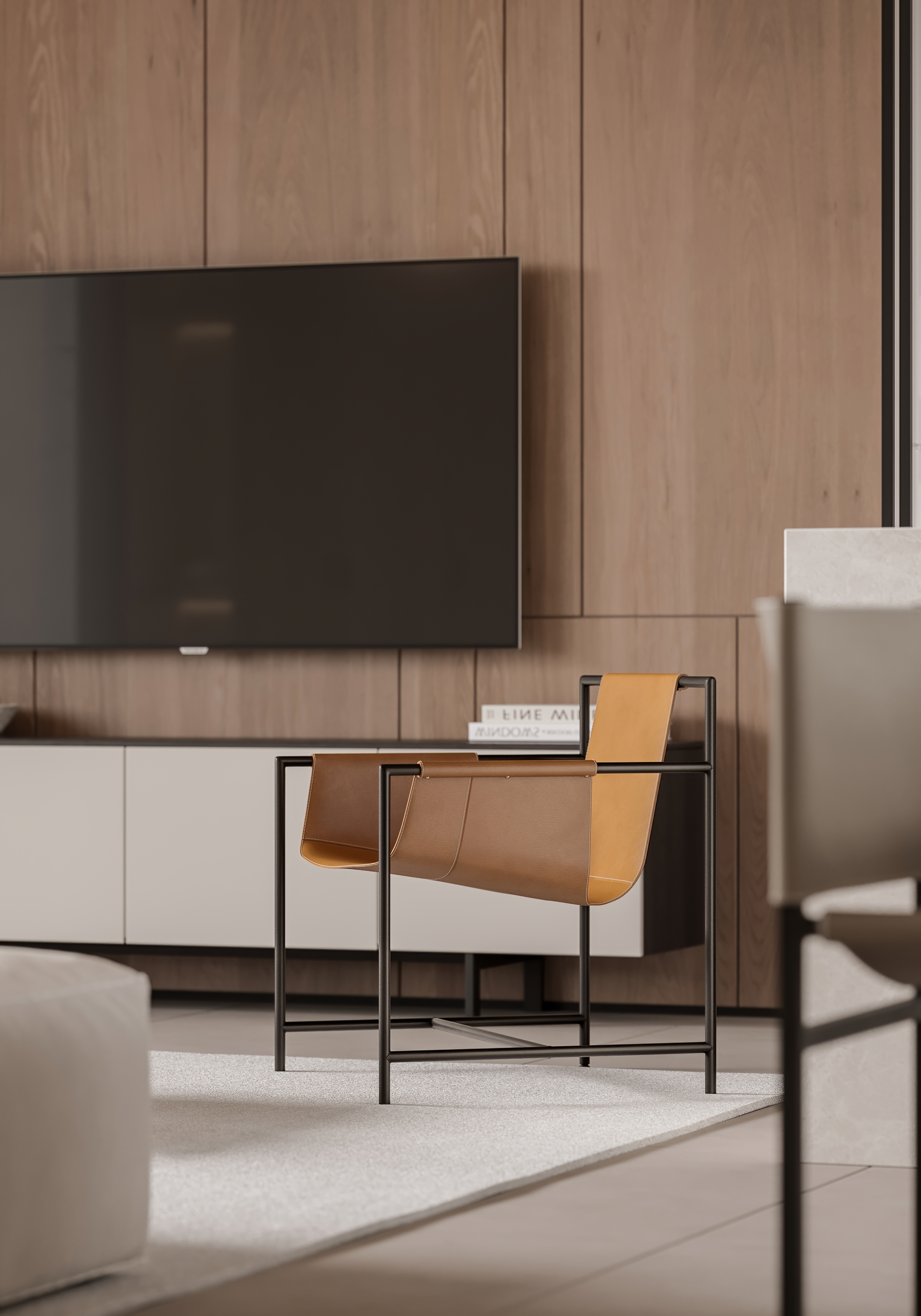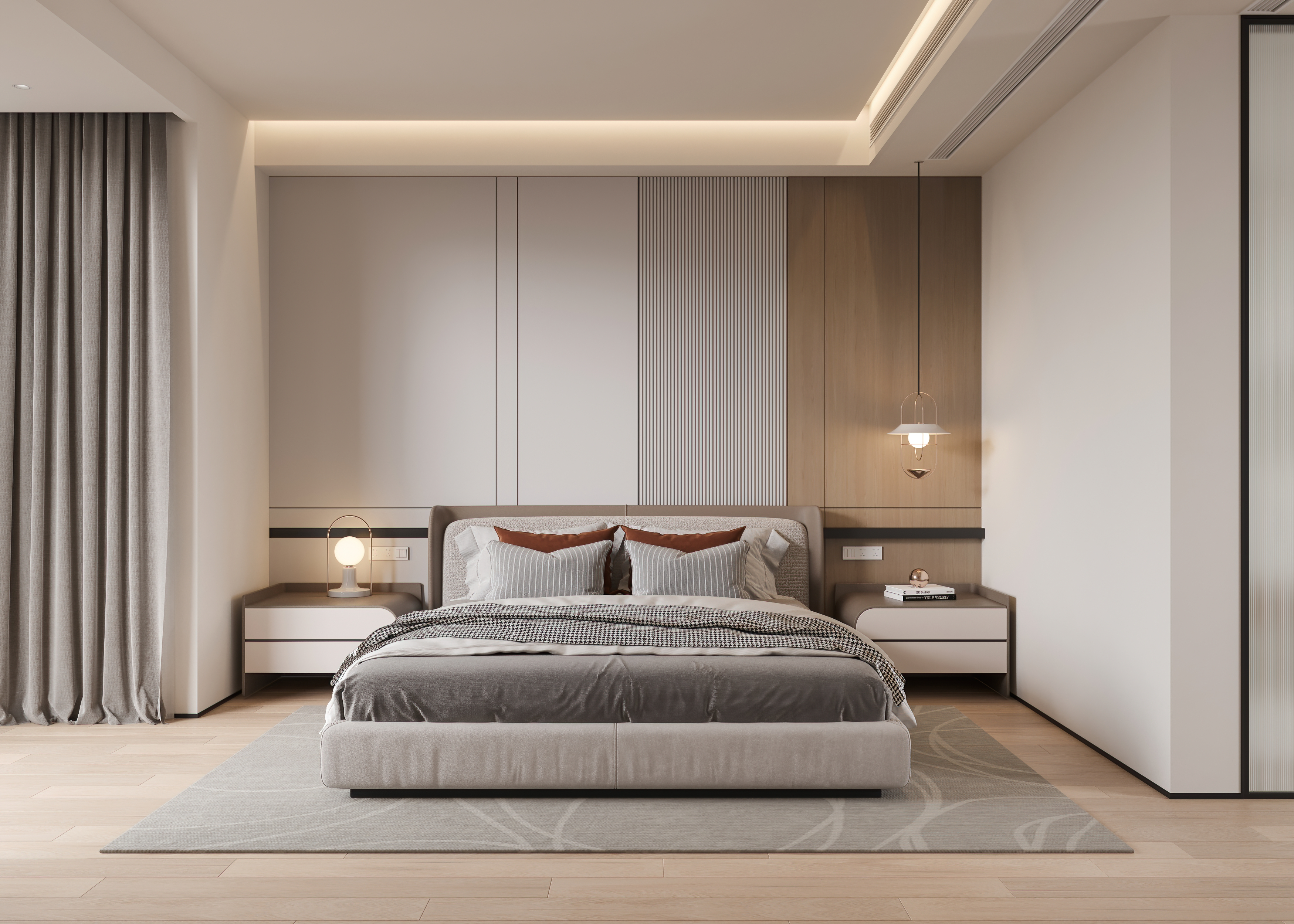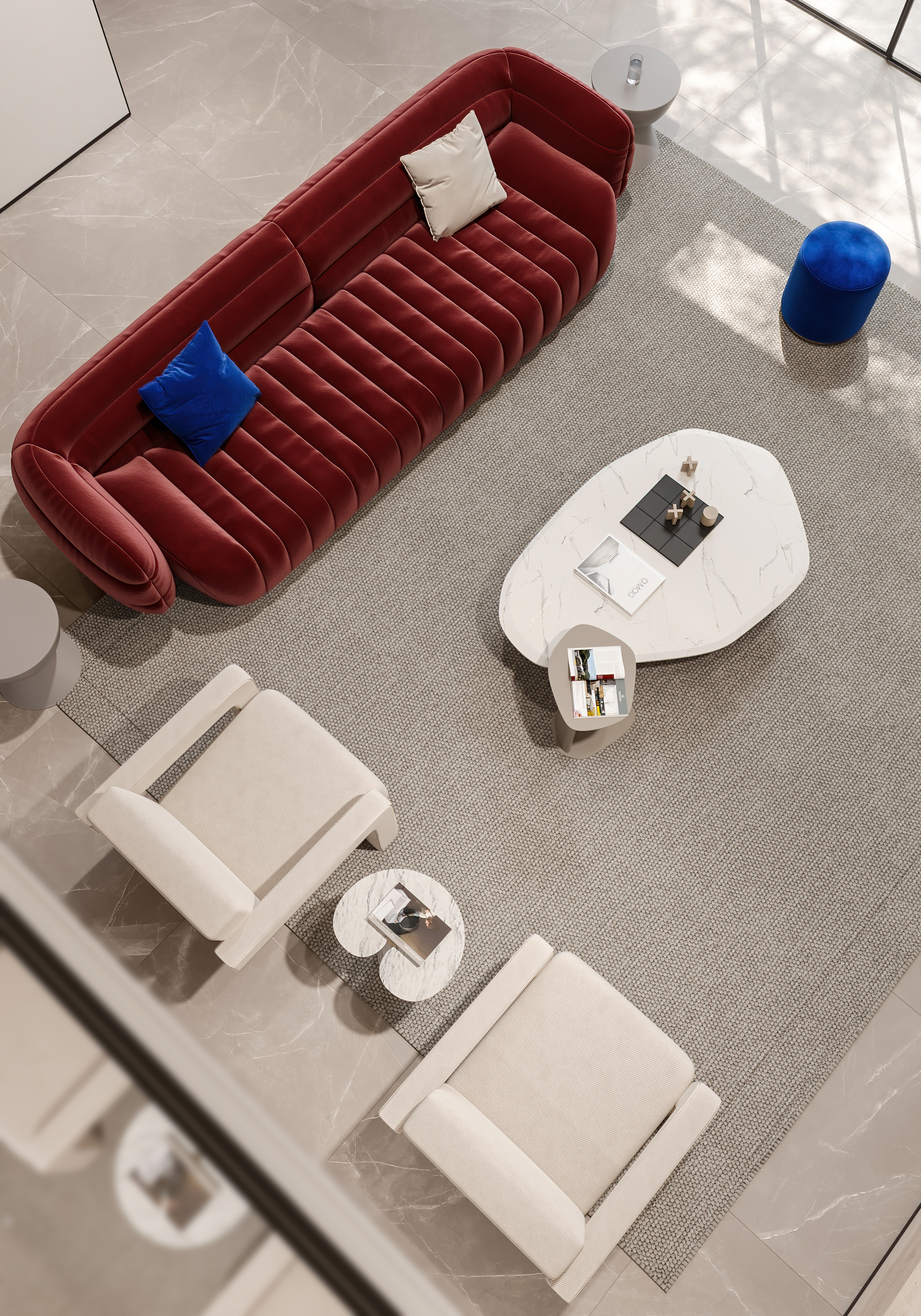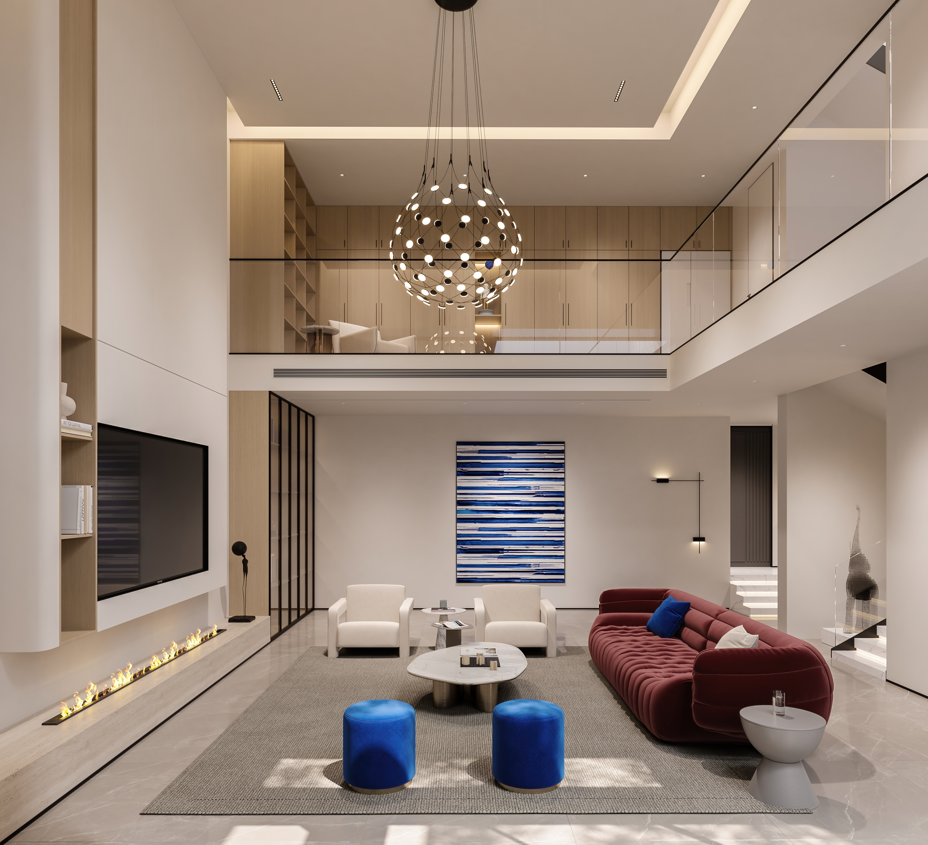 家具的摆放预留出过道,与地毯的铺设相得益彰。沙发与地毯采用同色系,起到空间延长的视觉效果,增加空间的层次感,勾勒出自由的对话区。
