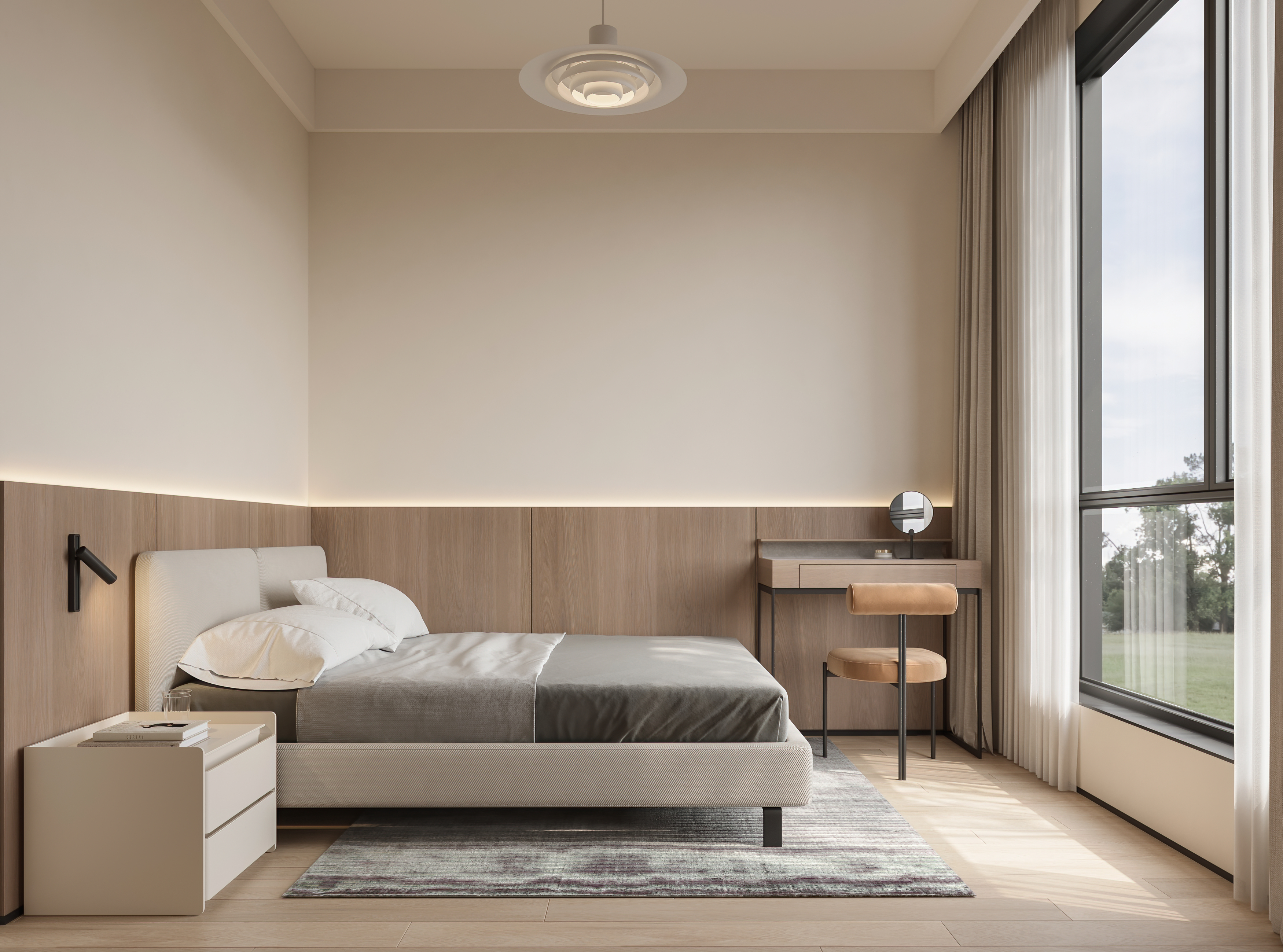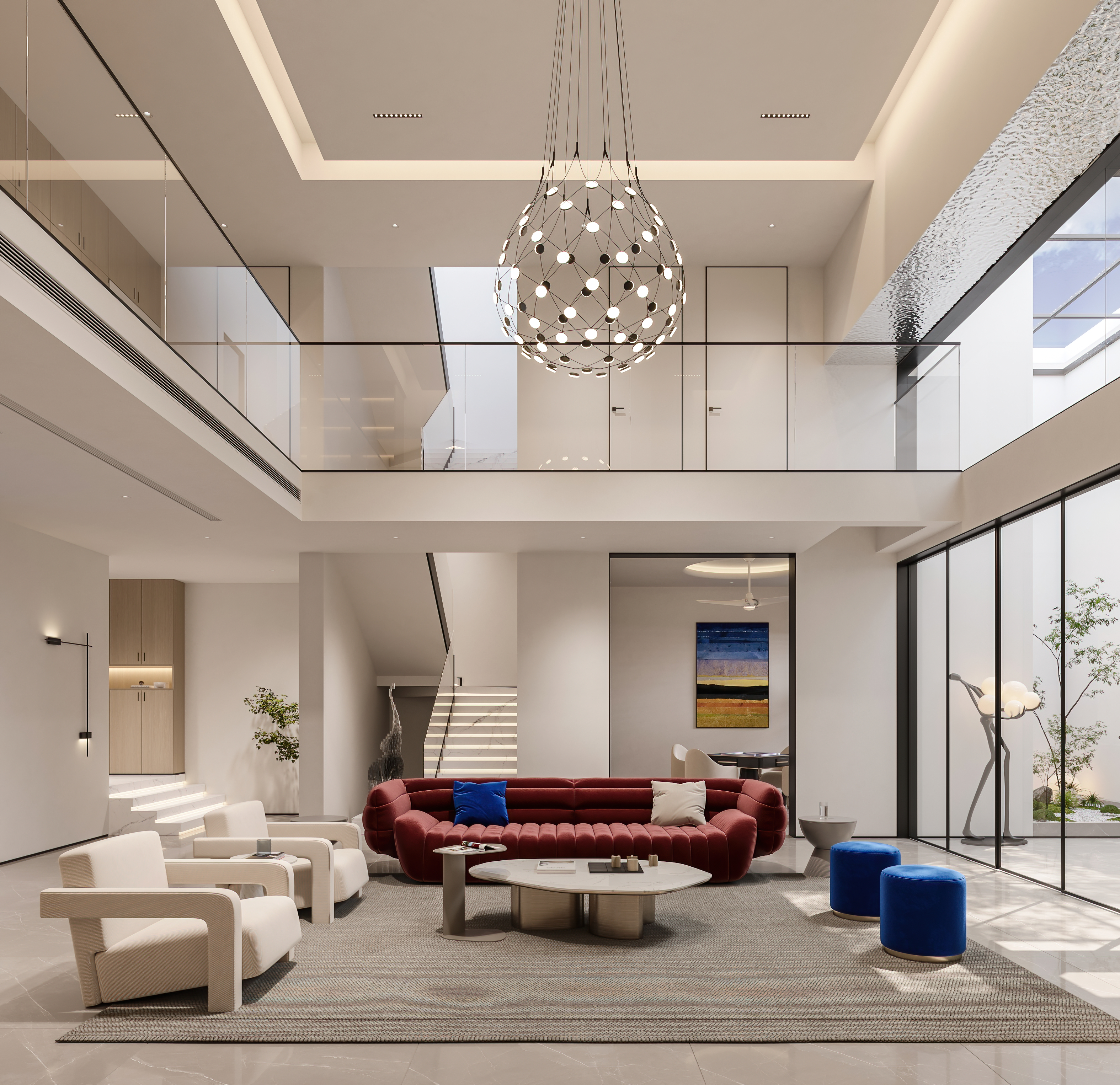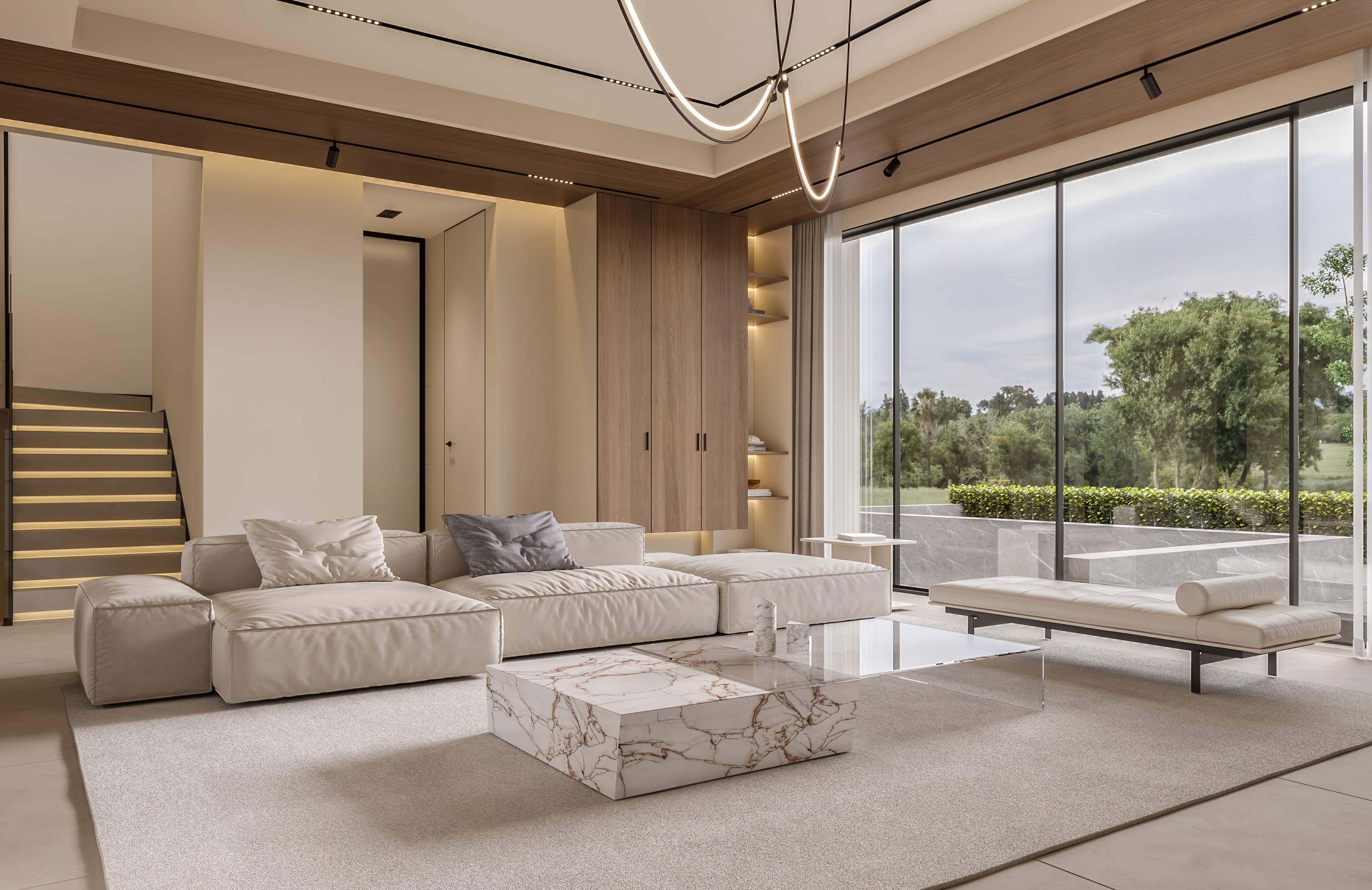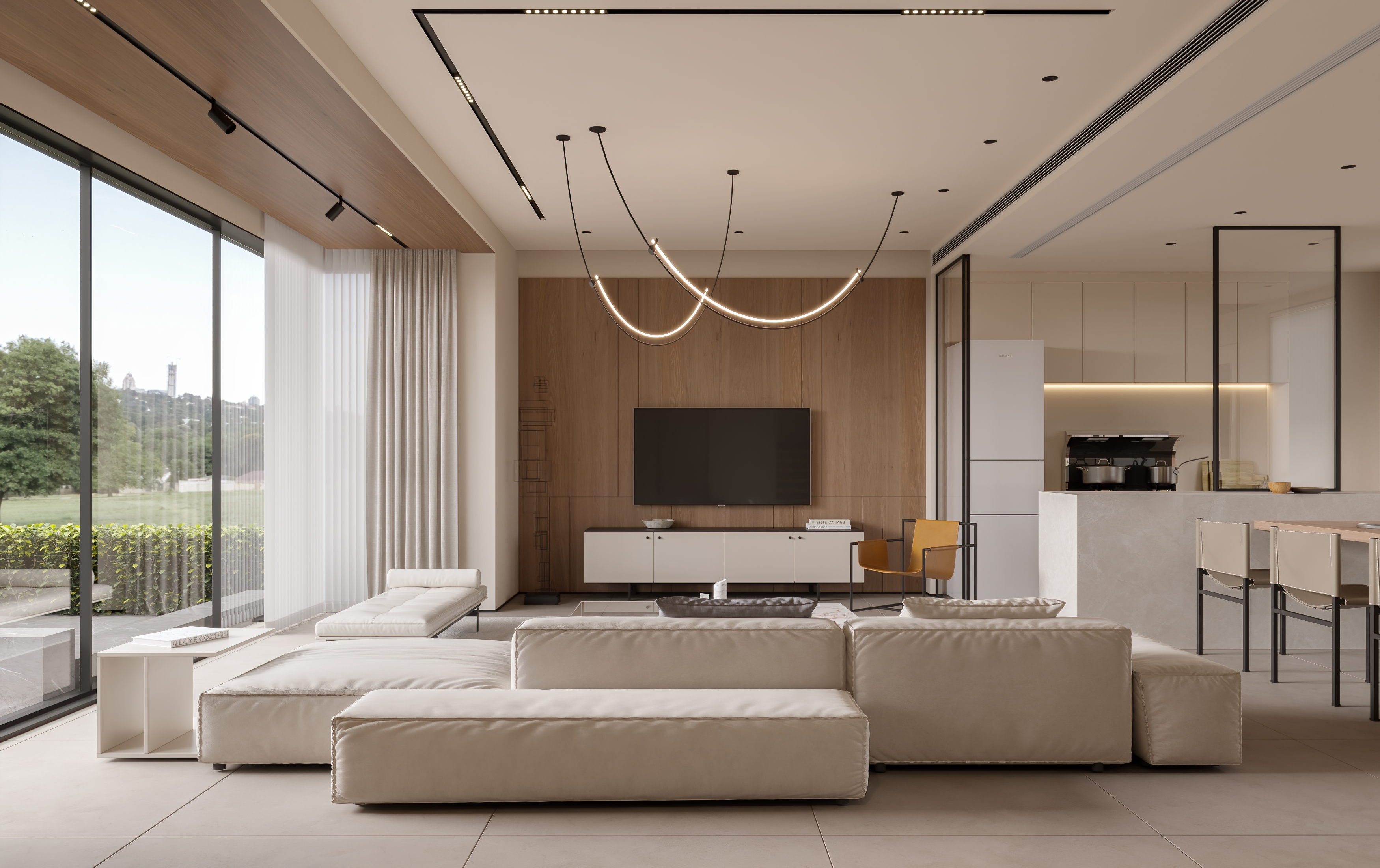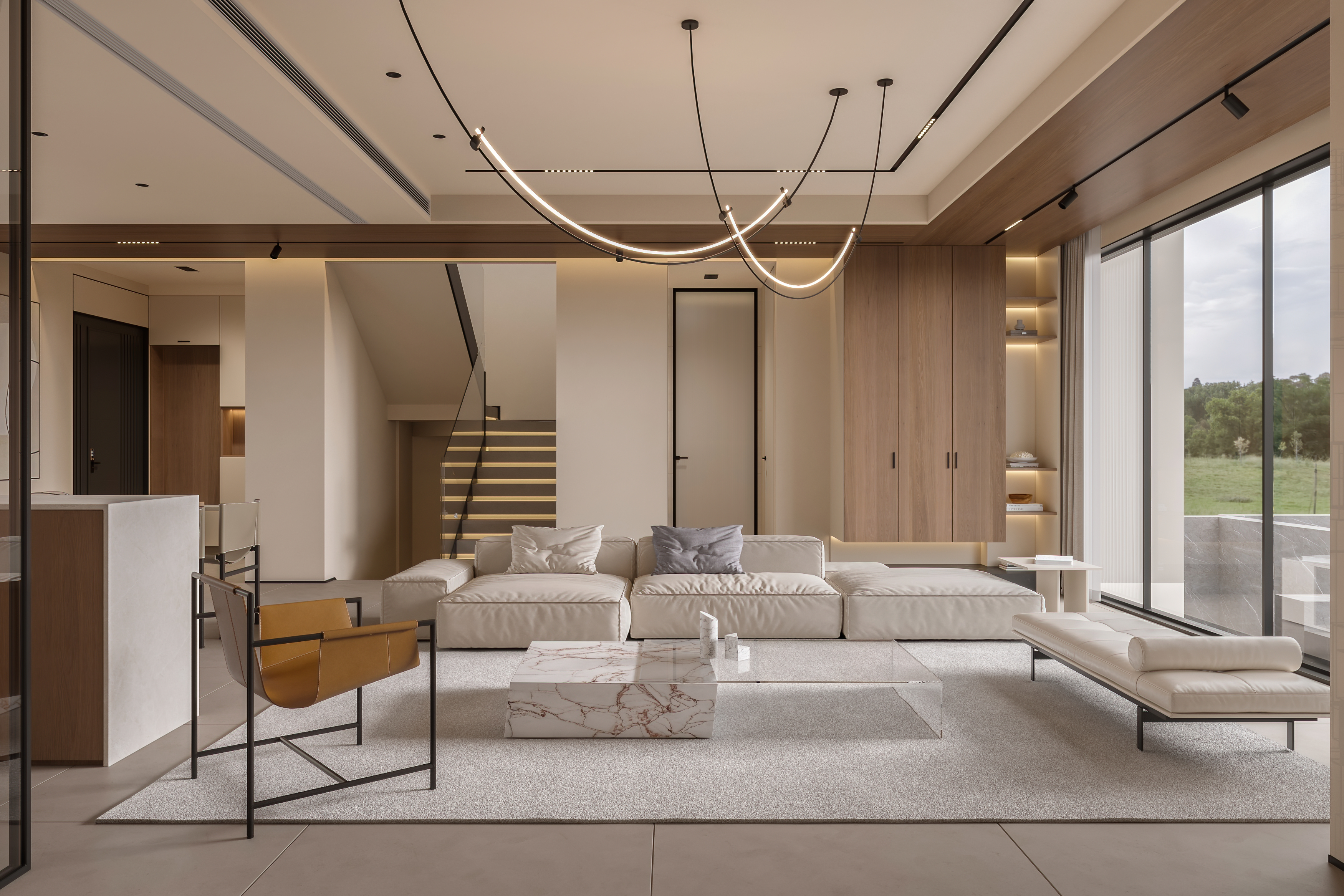 为了与自然产生更多的关联,客厅采用大落地玻璃窗,通过借景的方式,将光引入室内,光线随着自然变化,使空间视觉更加开阔和明朗。