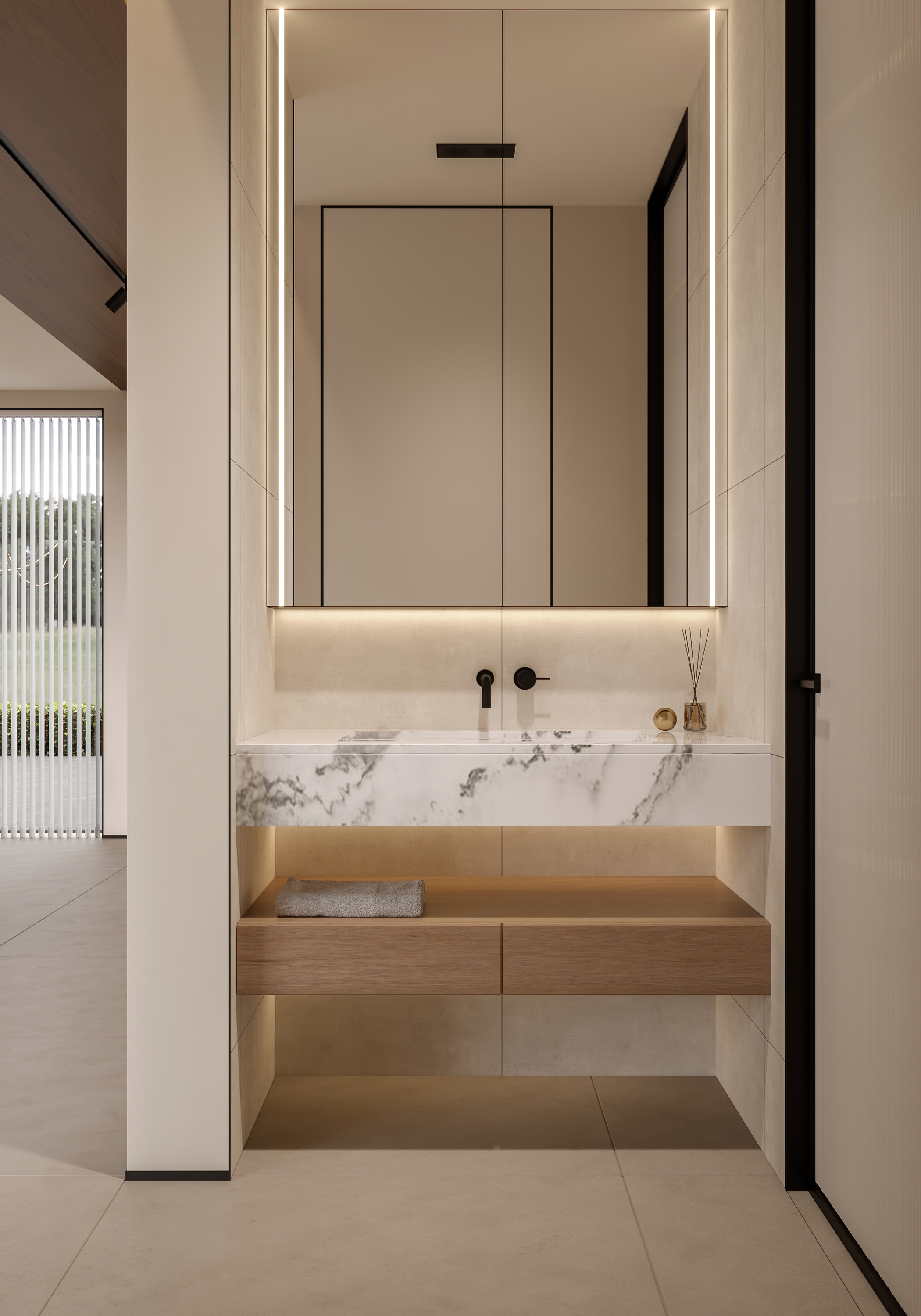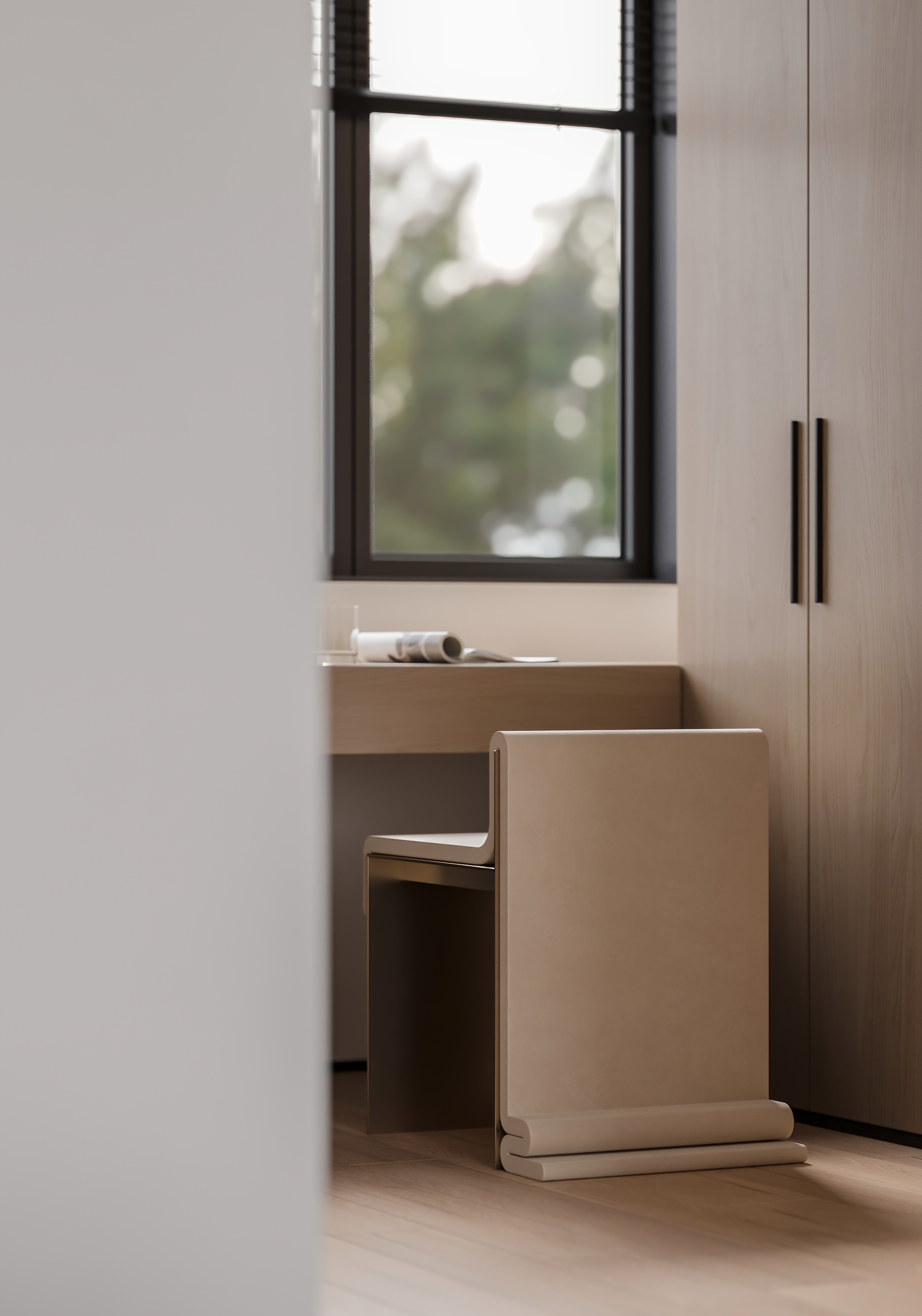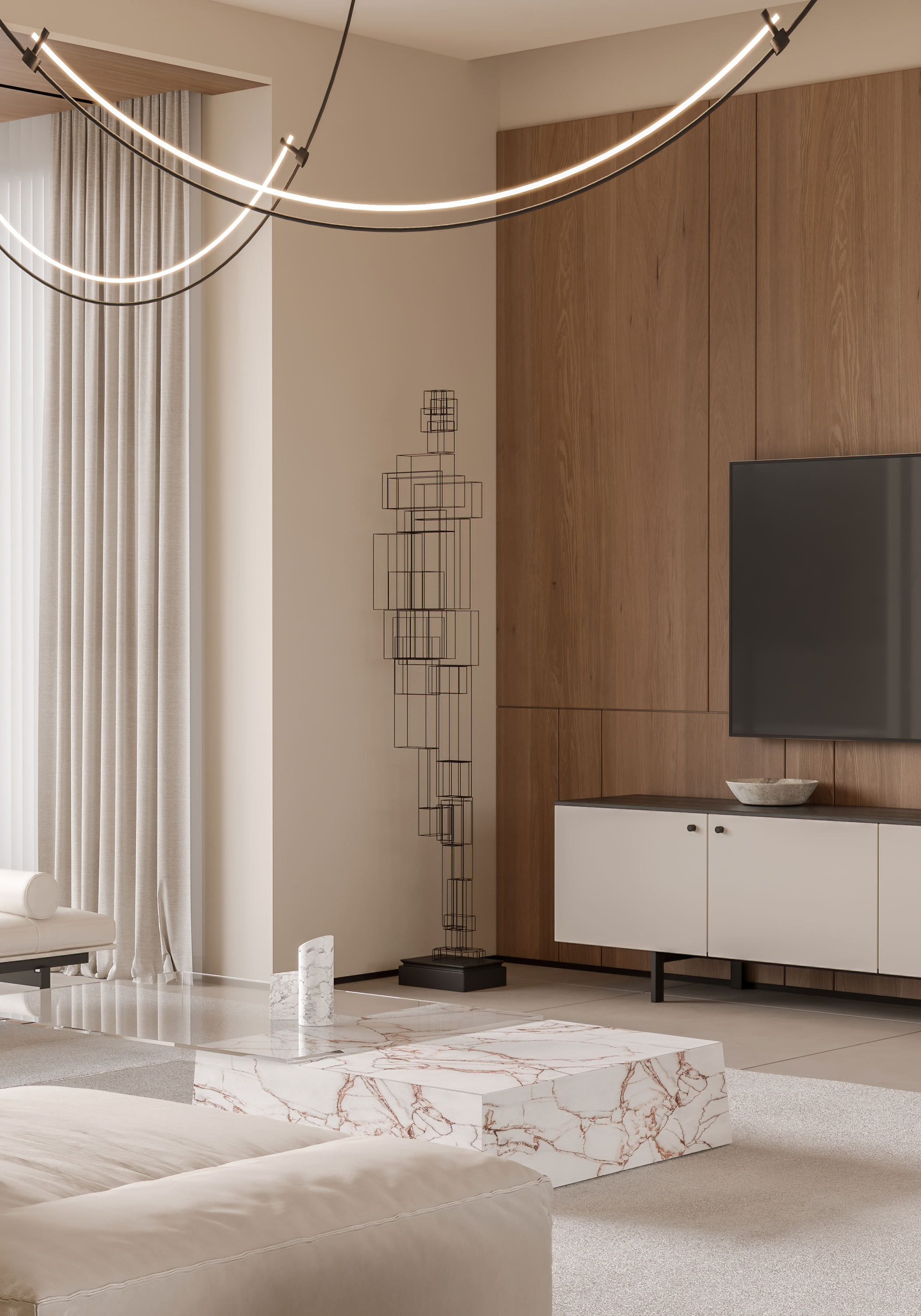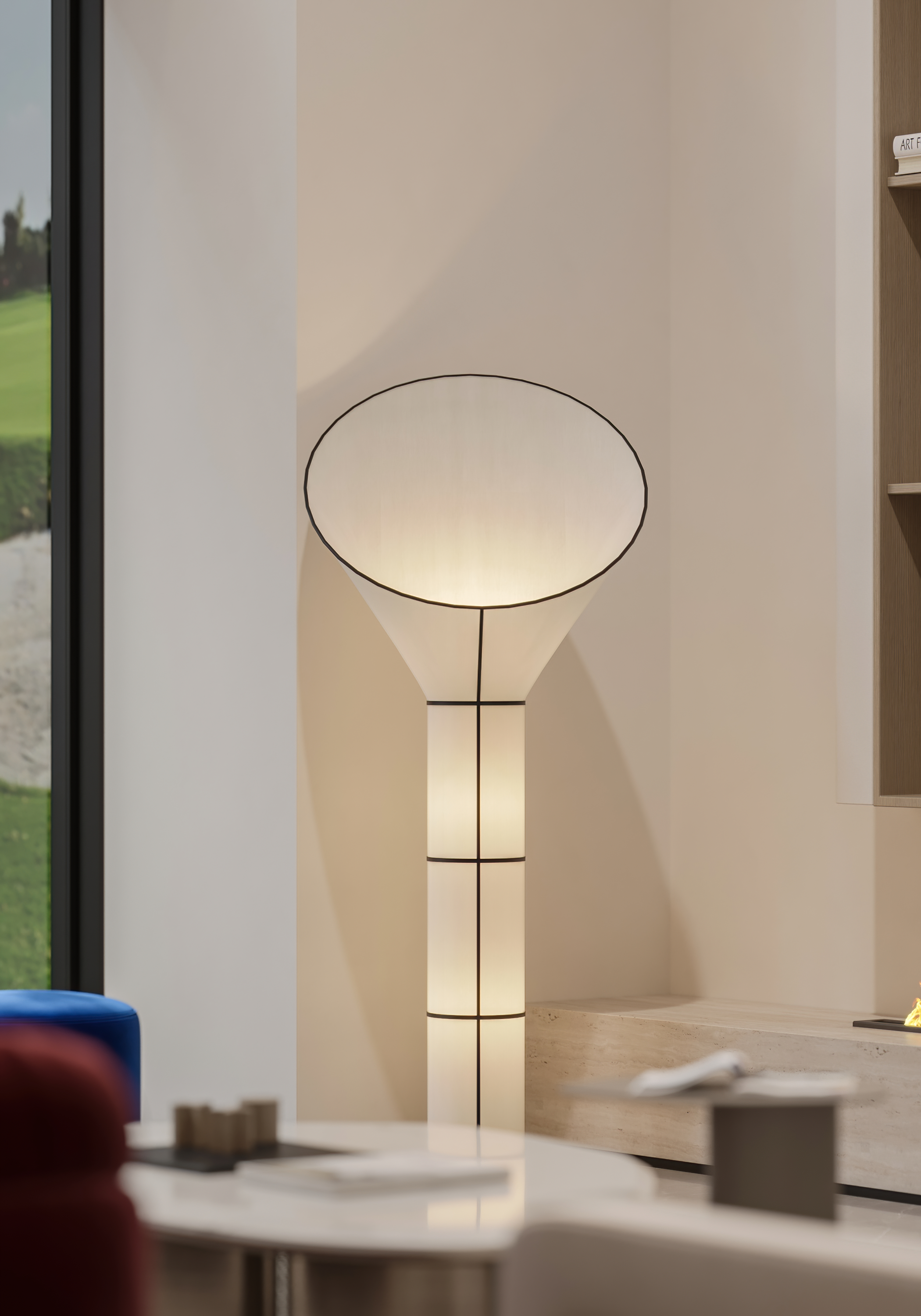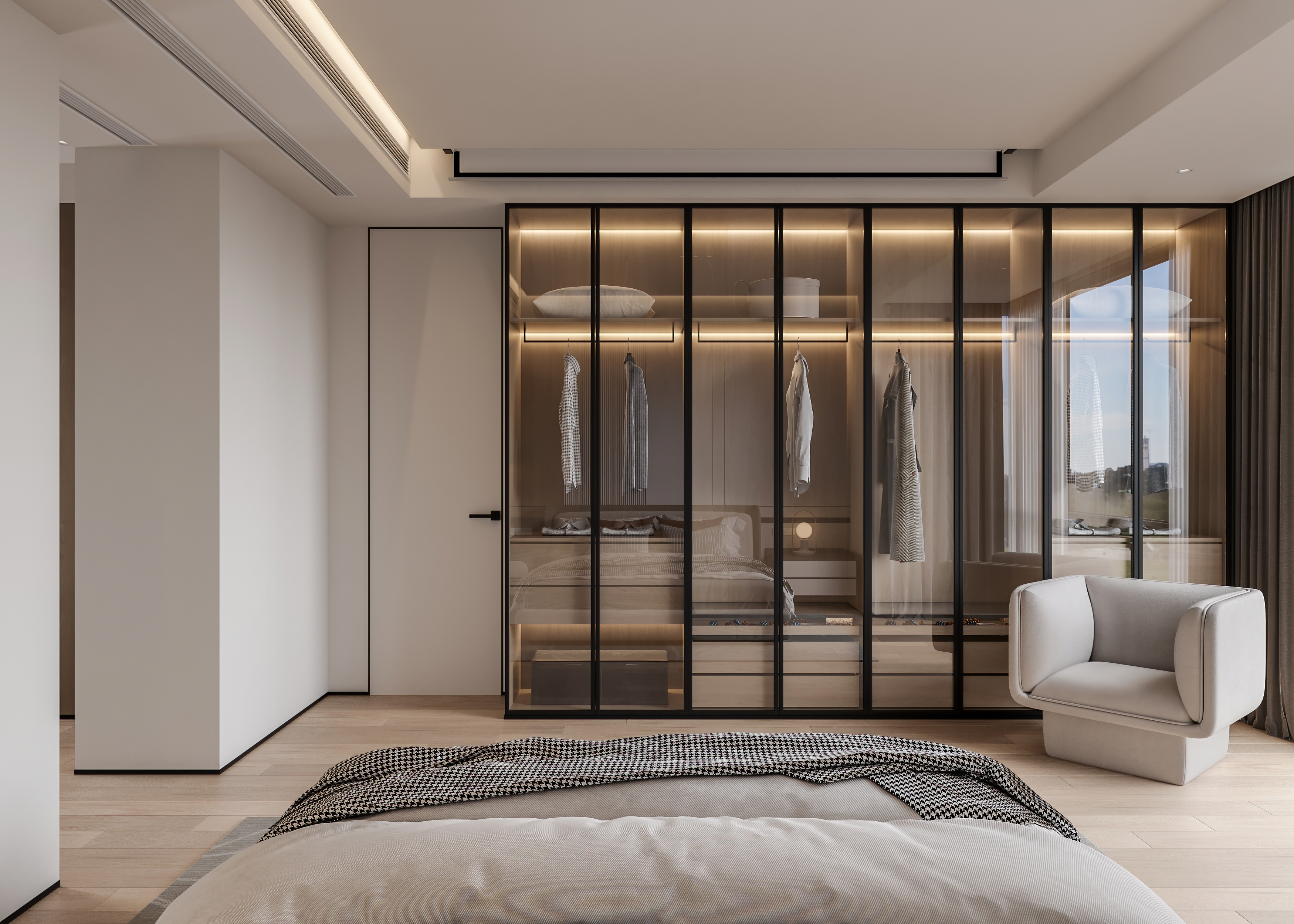 为了与自然产生更多的关联,客厅采用大落地玻璃窗,通过借景的方式,将光引入室内,光线随着自然变化,使空间视觉更加开阔和明朗。