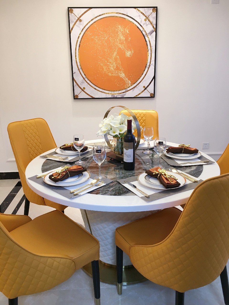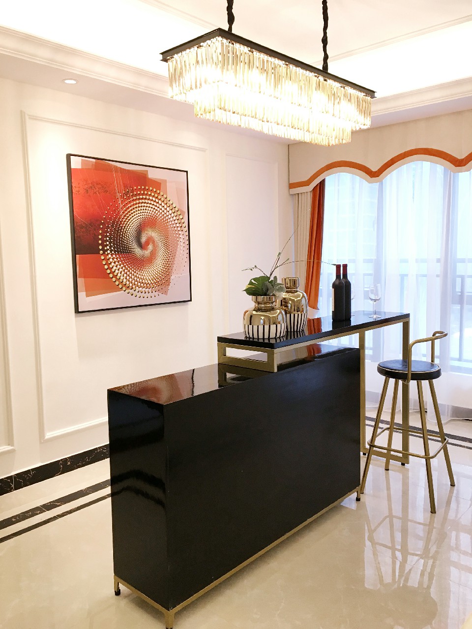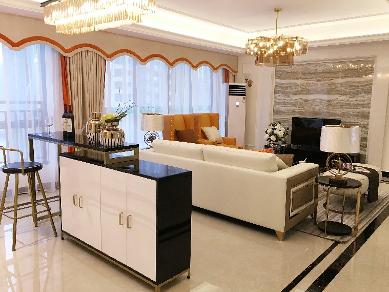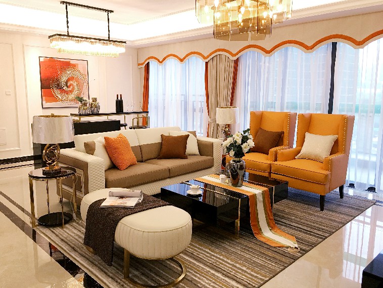 主题思想: 本案主要以豪华大气的橙色为主色调,添加黑白色为点缀,巧妙地运用黄铜元素来提升气质,它亮眼得很克制、奢华得很低调,结合皮革布艺等材质,传给细腻的质感。